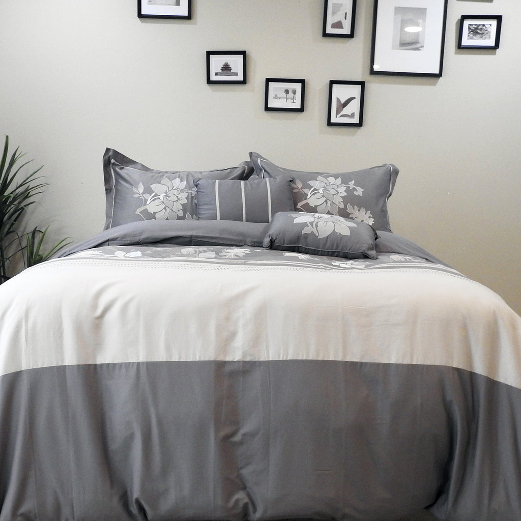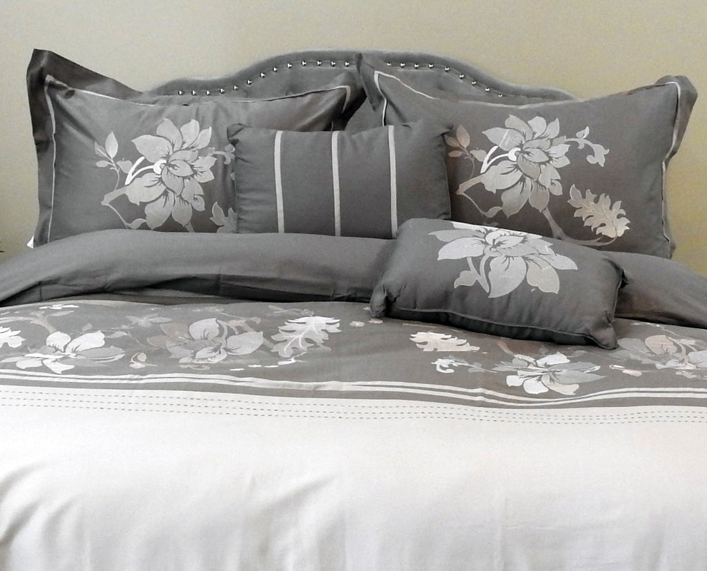 Fashion an alluring atmosphere in your bedroom with our luxurious Myra duvet cover set, made from 100% cotton woven at a 210 thread count per square inch. Features a lovely floral pattern and is available in three different colors that will add a delightful touch to your bedroom décor. Adding function to its beauty, This Myra duvet cover set comes complete with a duvet cover, two pillow shams, and two decorative pillows. The duvet cover has a secured button closure for quick removal.